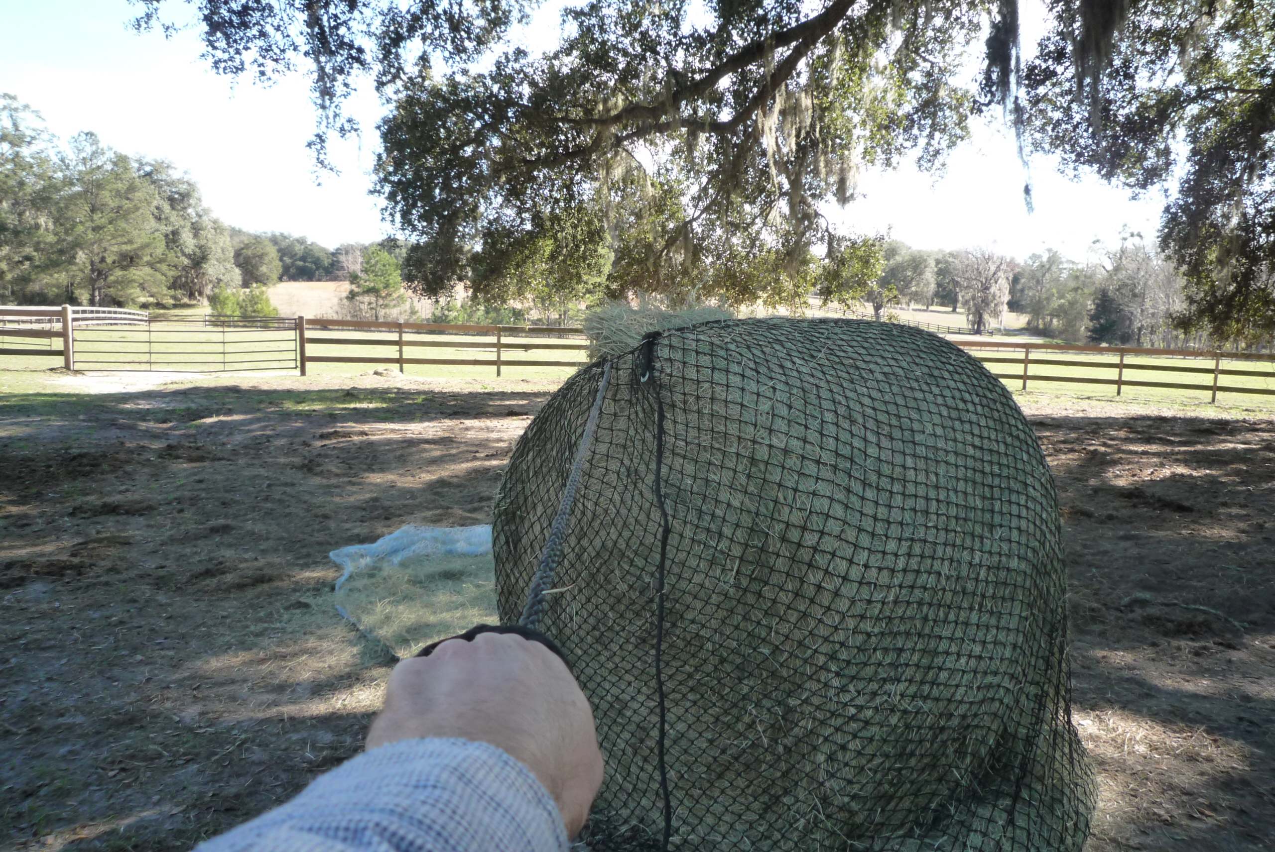 As a result, over time, we started using round bales, which allow the horses to eat when ready, pretty much all the time. The downside to the round bale is the waste. Horses eat. Horses eat and pee. Horses eat and poop. Horses do not mind doing this on and around the hay bale that they have hoofed apart in search of the most succulent grasses.
